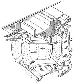 5) What was that T3 thing? I got lost in that part of the discussion. (2 students) T3 is an important design parameter for gas turbine engines. It is the turbine inlet temperature (the highest temperature in the cycle). As you can see from the performance plots for the Brayton cycle increasing the temperature ratio (T3/T1 where T1 is the atmospheric temperature) significantly increases the amount of work that can be derived from the engine per unit of mass flow. This is often desirable because at fixed thrust you can have a smaller engine (less drag, lighter, cheaper, etc.). Therefore, the gas turbine engine industry works very hard to find ways to increase the maximum allowable temperature in the cycle. So much so in fact that current engines operate with temperatures several hundred K above the melting temperature of the metals through which the gases flow. Just how hot is this "cool" air that keeps the turbine from melting? (1 student) The metal surfaces (blades, etc.) are protected by a layer of "cool" air (it is about 600-800K) that flows out of thousands of small holes on the surfaces of the parts. Here is a picture I took from a from Rolls-Royce book to give you an idea of what the inside of a turbine looks like.