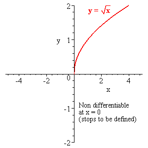 A function which jumps is not differentiable at the jump nor is one which has a cusp, like |x| has at x = 0.