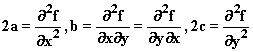 The behavior of the quadratic function here is, apart from a constant, captured by the coefficient a, b and c, which are related to partial derivatives as follows