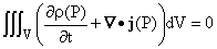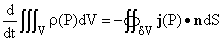 The content of this equation is of course exactly that of the original law: that the change of the amount of mass or charge in a volume is the amount that flows into V less the amount that flows out of it.
