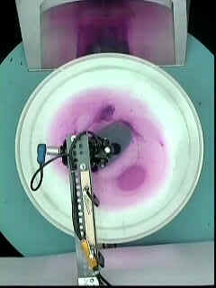 We rotate a disc at rate ω on the surface of a cylindrical tank of water (in fact, the disc is just submerged beneath the surface). The tank of water and the disc driving it is then rotated at rate Ω using our turntable and left for about 30 minutes to come to equilibrium. Once equilibrium is reached, dye crystals are dropped in to the water to trace the motions. The whole system is viewed from above in the rotating frame. Mirrors can be used to capture a side view, as shown below.
