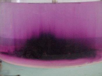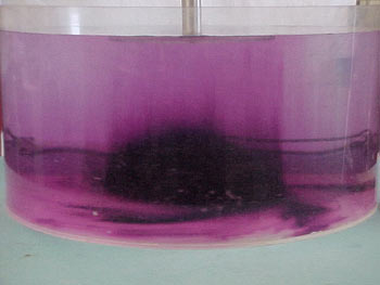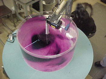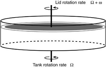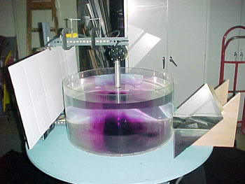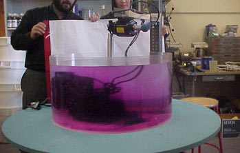 We rotate a disc at rate ω on the surface of a cylindrical tank of water (in fact, the disc is just submerged beneath the surface). The tank of water and the disc driving it is then rotated at rate Ω using our turntable and left for about 30 minutes to come to equilibrium. Once equilibrium is reached, dye crystals are dropped in to the water to trace the motions. The whole system is viewed from above in the rotating frame. Mirrors can be used to capture a side view, as shown below.