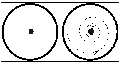 When the apparatus is not rotating, water flows radially inward from the diffuser to the drain in the middle. When the apparatus is rotating, however, water in the interior conserves angular momentum and, in so doing, acquires a vigorous swirling motion. The water spirals inward, as sketched in the diagram. The centrifugal force directed radially outward is balanced by a pressure gradient force directed radially inward. This pressure gradient force is set up by the free surface tilting relative to the horizontal.