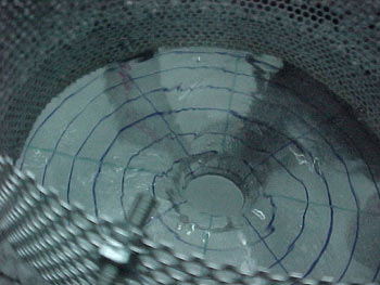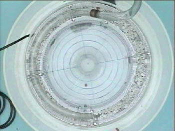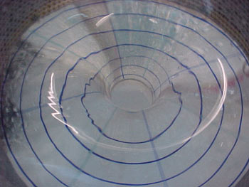 Take a roughly 40 cm cylindrical tank of approximately 15 cm depth with a drain hole in the center of the bottom. A diffuser with 30 cm inside diameter is constructed of a wire screen, placed in the tank, and stones approximately 1cm in size used to fill the space between the screen and the outer wall of the tank. Water is then fed into the bottom of the rock bed through a loop hose with numerous holes (roughly 0.5 cm diameter), so that water is fed evenly into the bottom of the diffuser. The diffuser is effective at producing an axially-symmetric, inward velocity at the screen.