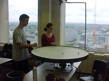 It is very instructive to make the surface of our turntable parabolic. This can readily be achieved by filling a large flat-bottomed pan with resin on a turntable and letting the resin harden while the turntable is left running (10 rpm works well) for several hours (see instructions). The resulting parabolic surface can then be polished to create a low friction surface.