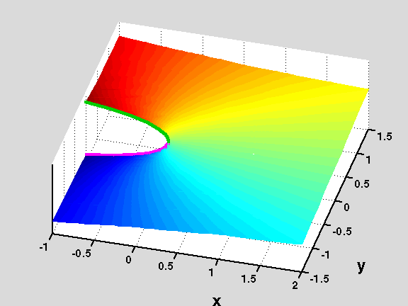 Figure 3: Surface generated by one of the branches where z=1 is not a branch point of f(z)=log(1-z1/2).