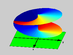 The reason is as follows: when joining the two cut planes to make the surface, we have to join the lower lip of the cut in one plane with the upper in the other (and conversely). But this cannot be done within three dimensional space, since once we join one pair of lips, the members of the other pair end up on different sides of the surface. To join this second pair, we must go into the “fourth dimension” (this is exactly the same sort of difficulty you would find if you try to make a knot in a curve while staying on a plane). What this all means is that: the Riemann Surface for the square root is an object in four dimensional space. In the pictures we have color coded the surface: at the (inevitable in three dimensions) crossings each of the two sheets that cross have a clearly distinct coloring (this is the best we could do with our 4-D coloring pens broken).