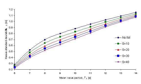 Heave standard deviation with foil at x=0m. AR=7.5, H1/3=6m and U=45 knots.