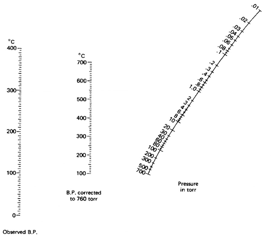 The picture below is a nomograph. using it and a ruler, you can determine at what temperature a liquid will boil under vacuum.