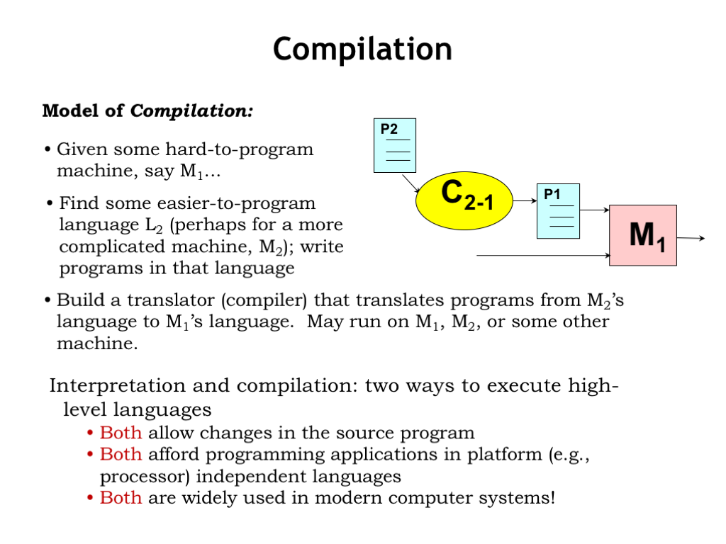 In compilation, we also start with our actual computer M1. Then we’ll take our high-level language program P2 and translate it statement-by-statement into a program for M1. Note that we’re not actually running the P2 program. Instead we’re using it as a template to create an equivalent P1 program that can execute directly on M1. The translation process is called “compilation” and the program that does the translation is called a “compiler”.