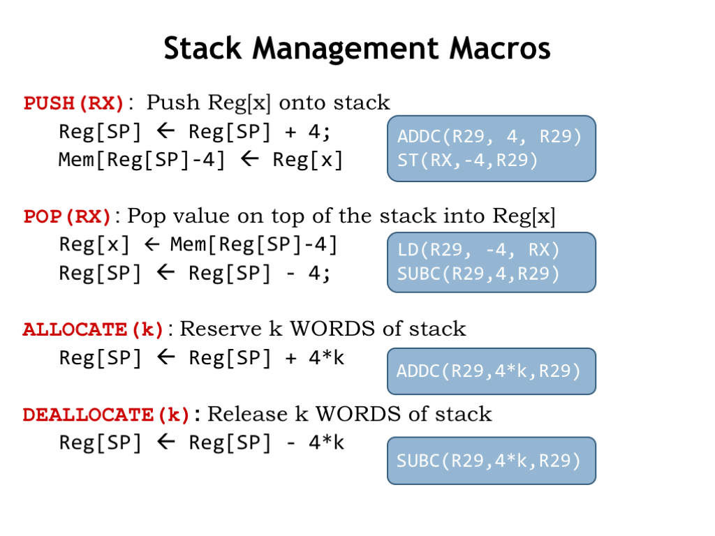 The PUSH macro expands into two instructions. The ADDC increments the stack pointer, allocating a new word at the top of stack, and then initializes the new top-of-stack from a specified register value with a ST instruction.
