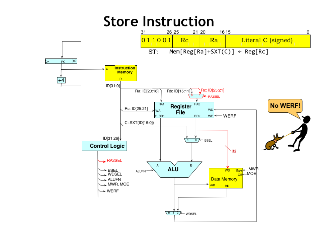 The output of the ALU is routed back to the write data port of the register file, to be written into the RC register at the end of the cycle. We’ll need another control signal, WERF (“write-enable register file”), that should have the value 1 when we want to write into the RC register. Let me introduce you to Werf, the 6.004 mascot, who, of course, is named after her favorite control signal, which she’s constantly mentioning.