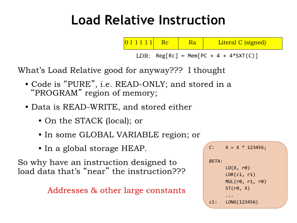 We have one last instruction to introduce: the LDR or load-relative instruction. LDR behaves like a normal LD instruction except that the memory address is taken from the branch offset adder.