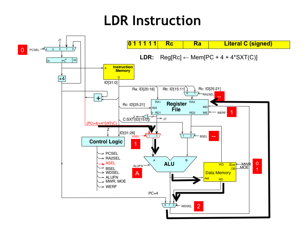 For LDR, ASEL will be 1, and we’ll then ask the ALU compute the Boolean operation “A”, i.e., the boolean function whose output is just the value of the first operand. This value then appears on the ALU output, which is connected to the main memory address port and the remainder of the execution proceeds just like it did for LD.