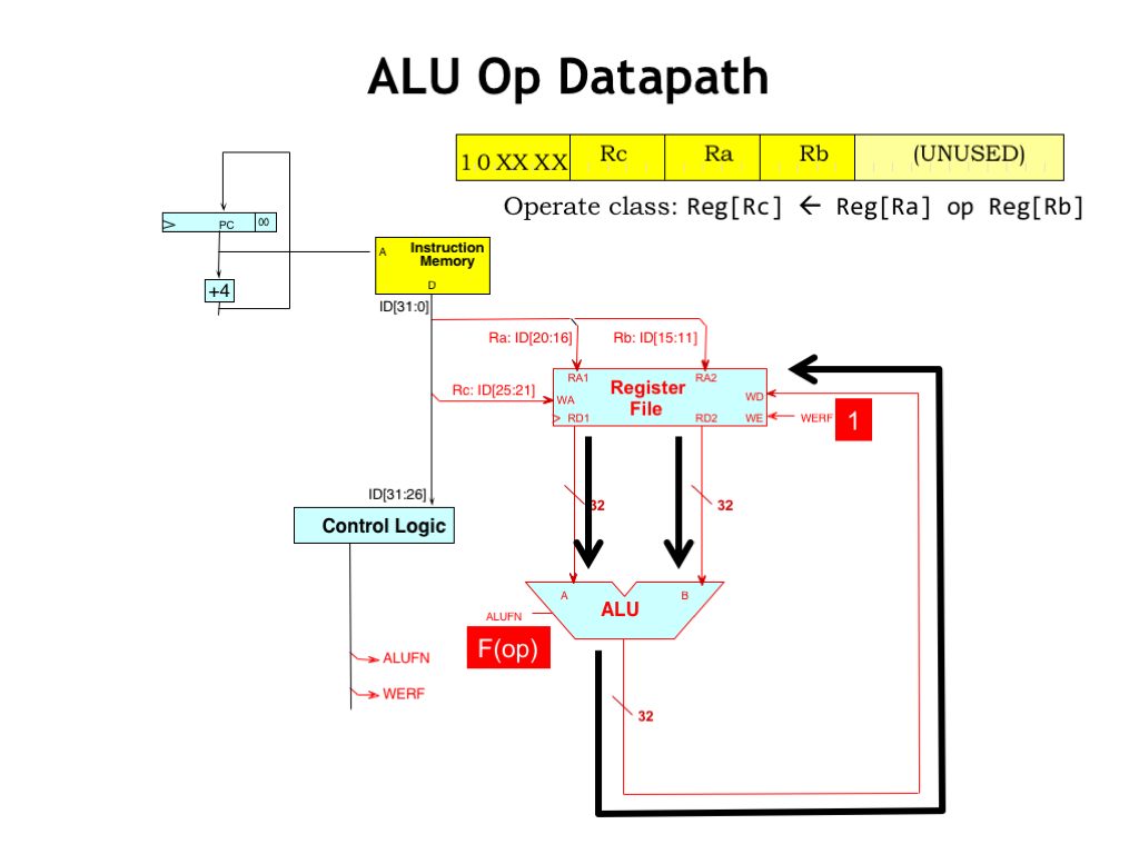 The result of the ALU’s computation is sent back to the register file to be written into the RC register. Of course, we’ll need to set WERF to 1 to enable the write.
