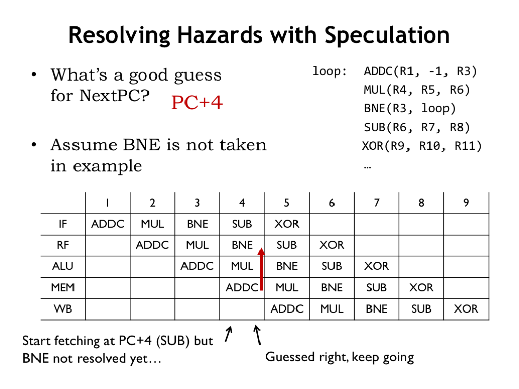 We can be smarter about when we choose to flush the pipeline when executing branches. If the branch is not taken, it turns out that the pipeline has been doing the right thing by fetching the instruction following the branch. Starting execution of an instruction even when we’re unsure whether we really want it executed is called “speculation”.