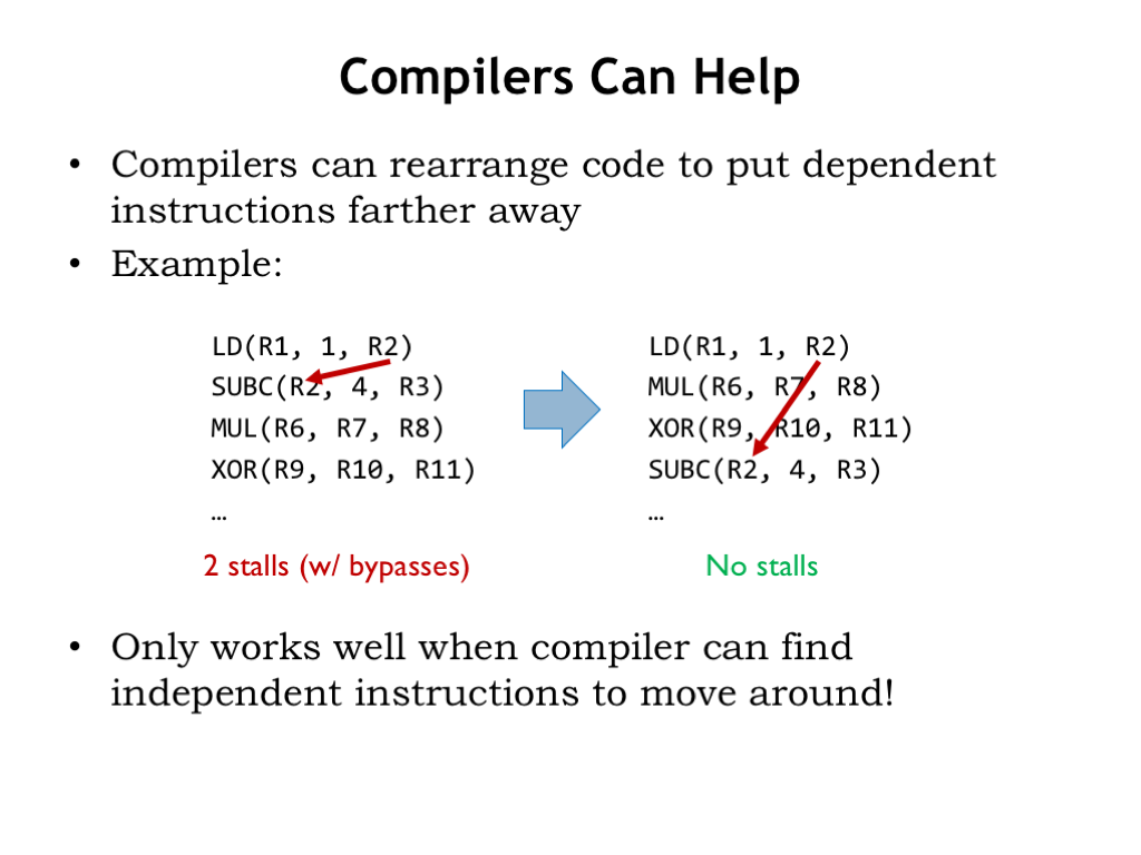 Compilers can help reduce dependencies by reorganizing the assembly language code they produce. Here’s the load-to-use hazard example we saw earlier. Even with full bypassing, we’d need to stall for 2 cycles.