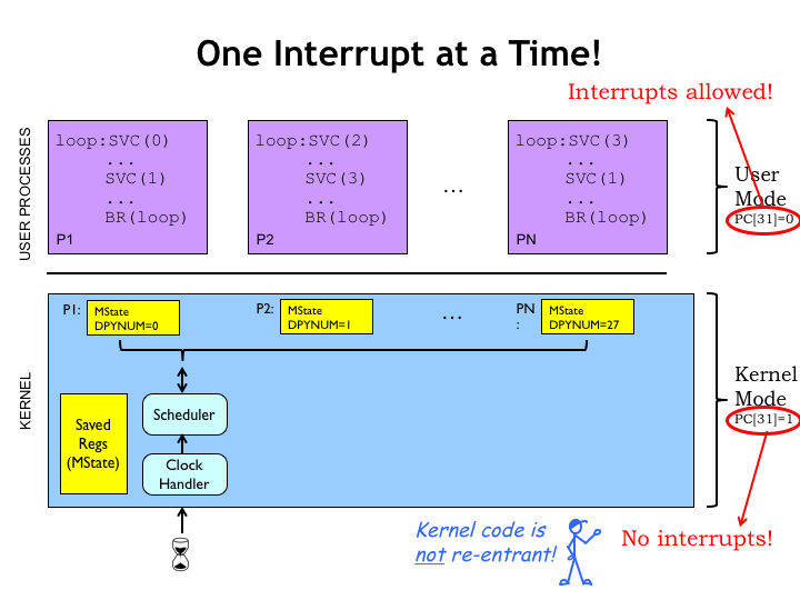 The SVC mechanism provides controlled access to OS services and data. As we’ll see in a few lectures, it’ll be useful that SVC handlers can’t be interrupted since they are running in supervisor mode where interrupts are disabled. So, for example, if we need to increment a value in main memory, using a LD/ADDC/ST sequence, but we want to ensure no other process execution intervenes between the LD and the ST, we can encapsulate the required functionality as an SVC, which is guaranteed to be uninterruptible.