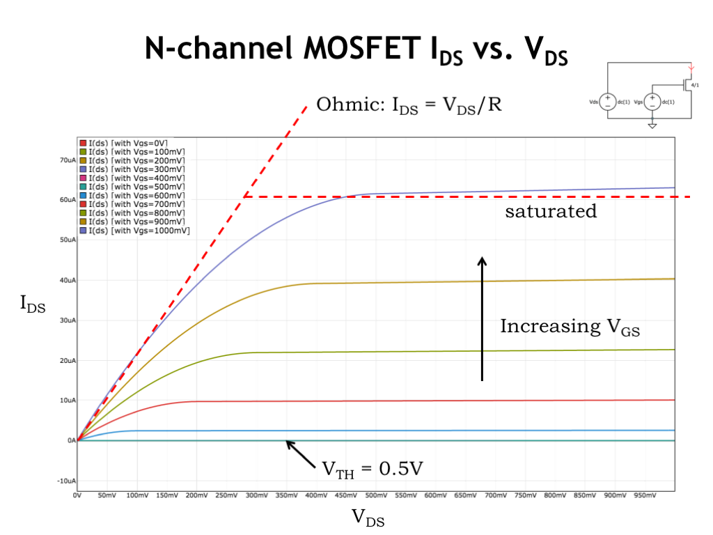 Once \(V_{\textrm{GS}}\) exceeds the threshold voltage \(I_{\textrm{DS}}\) becomes non-zero, and increases as \(V_{\textrm{GS}}\) increases. This makes sense: the larger \(V_{\textrm{GS}}\) becomes, the more substrate electrons are attracted to the bottom plate of the gate capacitor and the thicker the inversion layer becomes, allowing it to conduct more current. When \(V_{\textrm{DS}}\) is smaller than \(V_{\textrm{GS}}\), we said the MOSFET behaves like a resistor obeying Ohm’s Law. This is shown in the linear portions of the \(I_{\textrm{DS}}\) curves at the left side of the plots. The slope of the linear part of the curve is essentially inversely proportional to the resistance of the conducting MOSFET channel. As the channel gets thicker with increasing \(V_{\textrm{GS}}\), more current flows and the slope of the line gets steeper, indicating a smaller channel resistance.