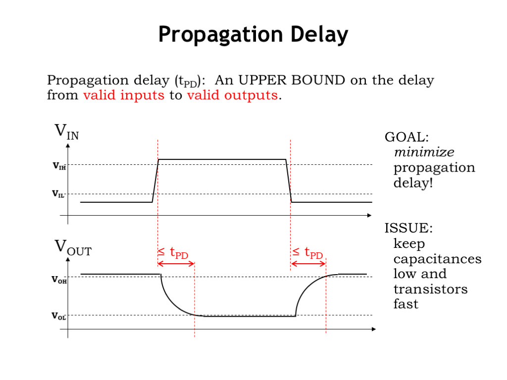 The propagation delay of a combinational logic gate is defined to be an upper bound on the delay from valid inputs to valid outputs. Valid input voltages are defined by the \(V_{\textrm{IL}}\) and \(V_{\textrm{IH}}\) signaling thresholds, and valid output voltages are defined by the \(V_{\textrm{OL}}\) and \(V_{\textrm{OH}}\) signaling thresholds. We’ve shown these thresholds on the waveform plots.