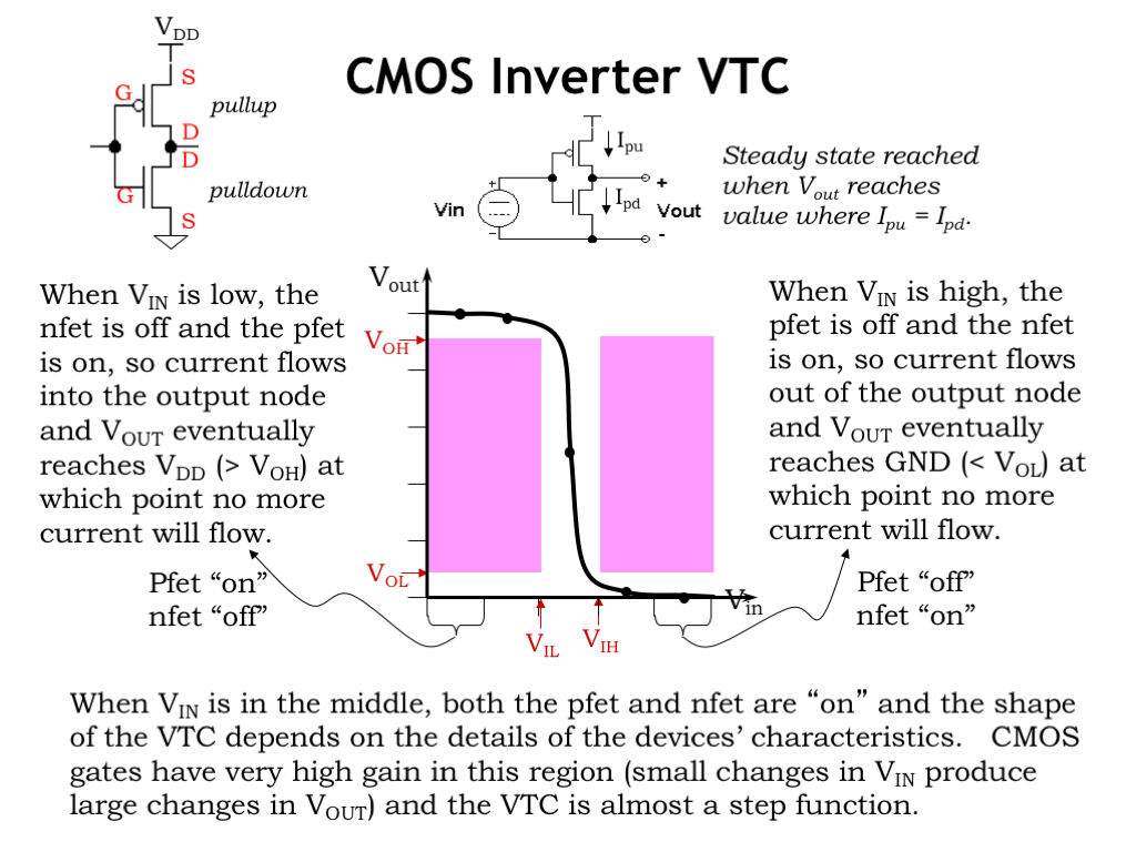 Now consider the CMOS implementation of a combinational inverter. If the inverter’s input is a digital 0, its output is a digital 1, and vice versa. The inverter circuit consists of a single NFET switch for the pulldown circuit, connecting the output node to GND and a single PFET switch for the pullup circuit, connecting the output to \(V_{\textrm{DD}}\). The gate terminals of both switches are connected to the inverter’s input node. The inverter’s voltage transfer characteristic is shown in the figure.