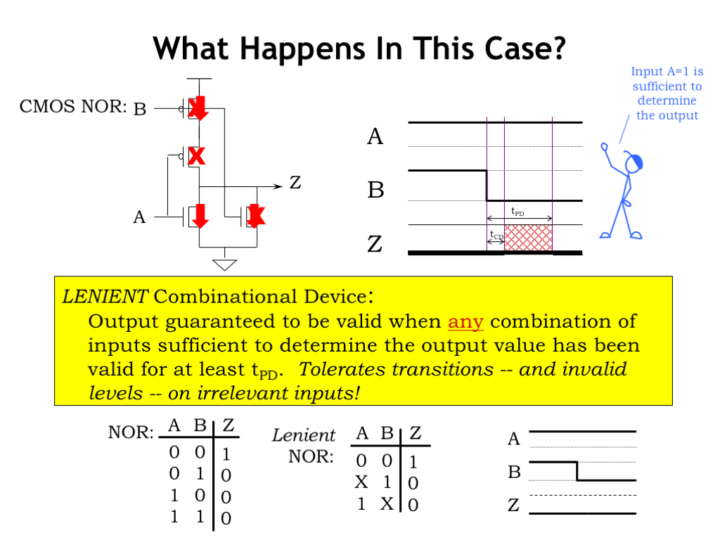 We can extend our truth-table notation to indicate lenient behavior by using X for the input values on certain rows to indicate that input value is irrelevant when determining the correct output value. The truth table for a lenient NOR gate calls out two such situations: when A is 1, the value of B is irrelevant, and when B is 1, the value of A is irrelevant. Transitions on the irrelevant inputs don’t trigger the \(t_{\textrm{CD}}\) and \(t_{\textrm{PD}}\) output timing normally associated with an input transition.