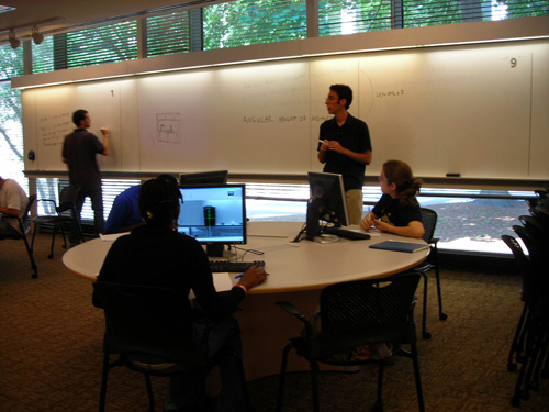A photo of a classroom with a teacher at the front, a student at the whiteboard, and two students at a round table.