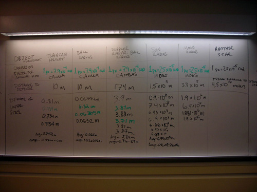 A whiteboard with a handwritten table detailing different linear sizes of various astronomical objects.