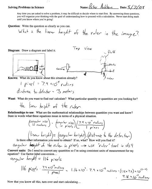 A word problem that reads "Any time you are asked to solve a problem, it may be difficult to decide where to start first. By answering these questions, you will organize your thinking with the goal of understanding how to proceed with a calculation. Never start doing math until you know where you're going! Question; Diagram; Known; Want; Relationship to use; Convert units