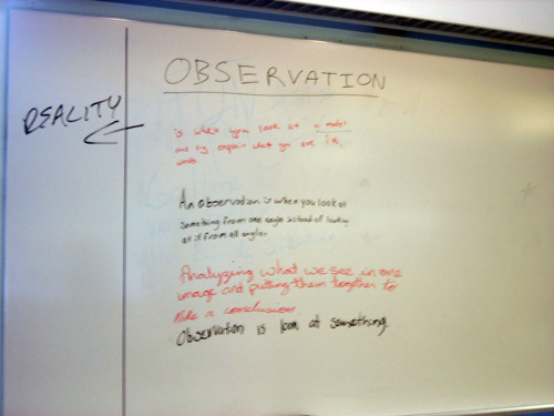 A whiteboard with notes written on it about explanations and definitions of observation.