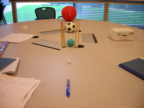 A photo of a four different-sized models in a line from smallest to biggest. A ruler sits on either side of the line of balls to demonstrate the angular size of the balls.
