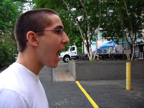 A trick photo where a person stands in profile in the foreground with their mouth open. A parked truck is in the background. It looks as if the person is about to eat the truck.