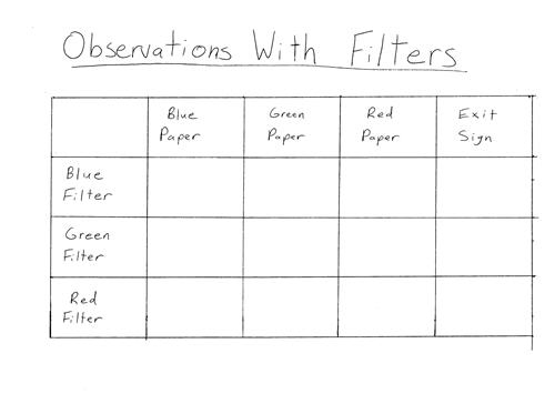 A hand drawn chart to be filled in with the title "Observations with Filters." The column headers are blue paper, green paper, red paper, and exit sign. The rows are blue filter, green filter and red filter.
