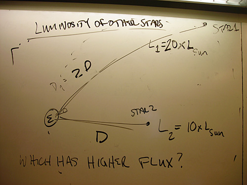 Handwritten notes on a whiteboard about luminosity of other stars.
