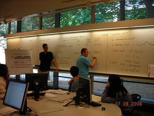 A teacher observes a student working on a problem involving invisible light at the whiteboard.