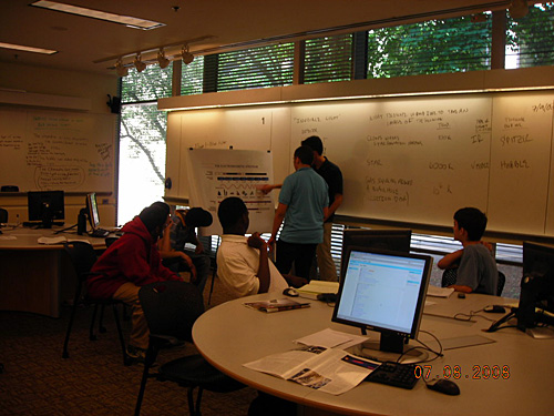 A photo of a teacher standing at the front of a classroom pointing at a chart explaining invisible light to students.