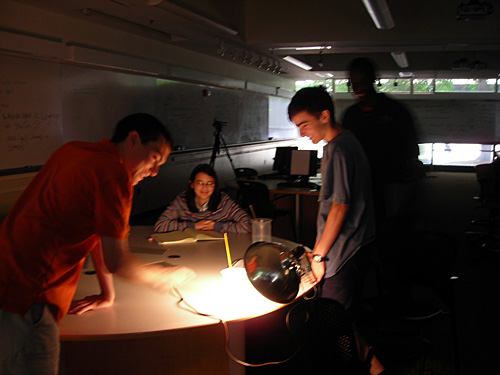 Students stand at a round table in a darkened room observing a thermometer in a beaker of water, while a bright light shines on it.