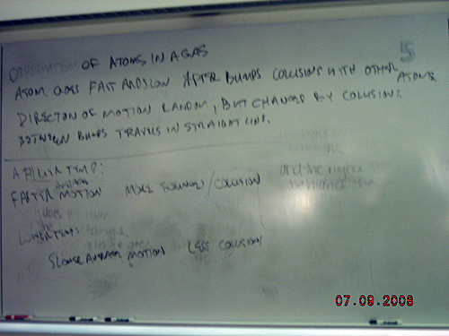 Handwritten notes on a whiteboard about observations of atoms in a gas.