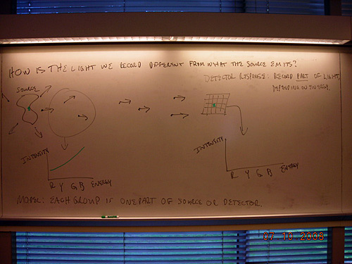 Handwritten whiteboard notes on How is the light we record different from what the source emits?