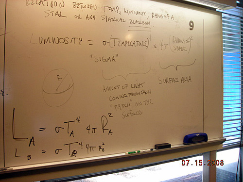 Handwritten notes on a whiteboard about the relationship between temperature, luminosity, and radius of star.