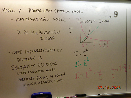 Handwritten notes on a whiteboard showing the power law spectrum model.