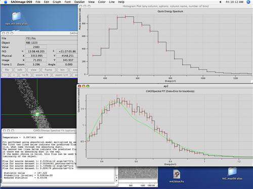 Screenshots showing data, two graphs, and an image in outer space.