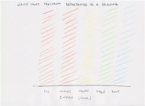 A drawing titled White Light Spectrum Represented as a Drawing. Five columns are shown in the following colors red, orange, yellow, green, and blue.