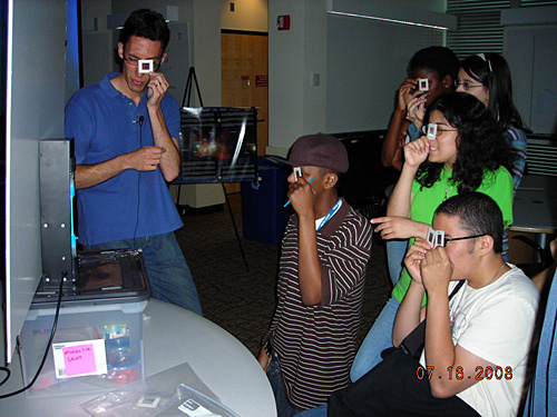 A photo of a demonstration of diffraction emission. A group of people al hold up small squares to their eyes as they view a light source.