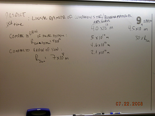 A photo of notes on a whiteboard that show calculations about linear diameter of blocking material.