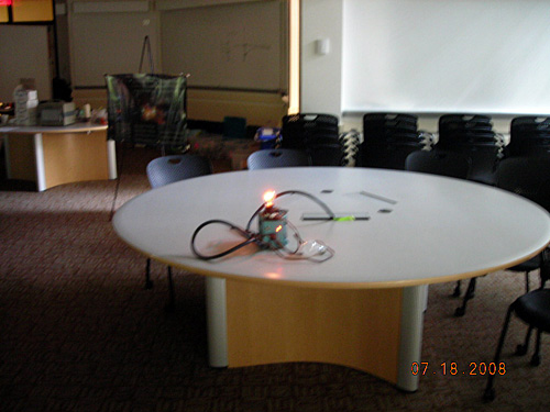 A photo of a demonstration of the brightness of a bulb. A very bright glowing lightbulb sits on a round table