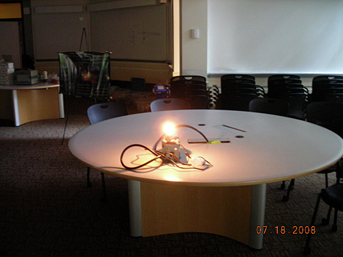 A photo of a demonstration of the brightness of a bulb. A very bright glowing lightbulb sits on a round table