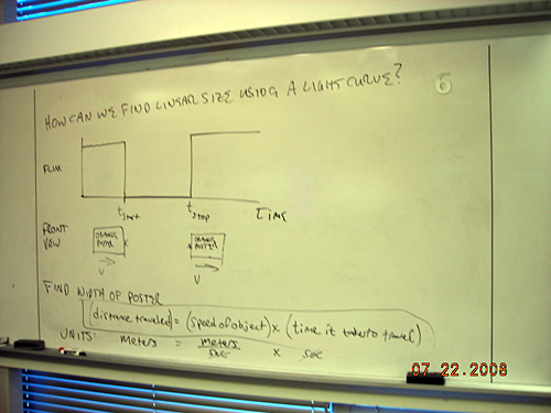 A photo of notes on a whiteboard about finding linear size using a light curve