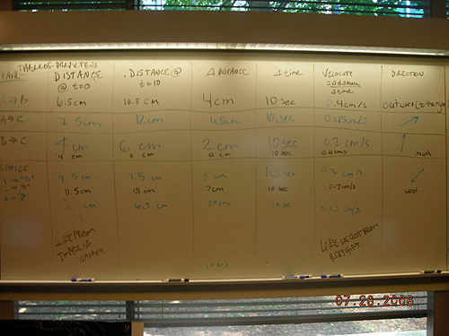 Handwritten notes on a whiteboard depicting an expanding universe table.